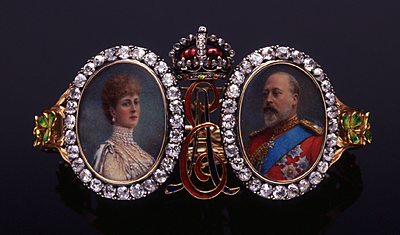 エドワード七世とアレクサンドラ王妃のミニアチュールに王冠とE.A.のイニシャルが、また腕の部分にはアイルランドの国花シャムロックがギルロッシュエナメルで装飾されたバングル。