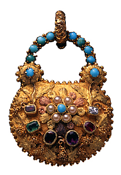| 19世紀初期のセンチメンタルな装身具を代表する作品。パドロック(錠前)はとらえられた愛情を意味し、表面には、当時流行の宝石による文字遊びである、REGARD(敬愛の意・アルファベットの順番に宝石の頭文字を並べたもの)装飾がされています。また、中央の真珠とトルコ石で忘れな草の花を表し、花言葉より「私を忘れないで」という思いを表したメッセージジュエリーとなっています。金台には、カラーゴールドによる精巧な細工が施され、様々な宝石との色彩のコントラストを見せています。 |